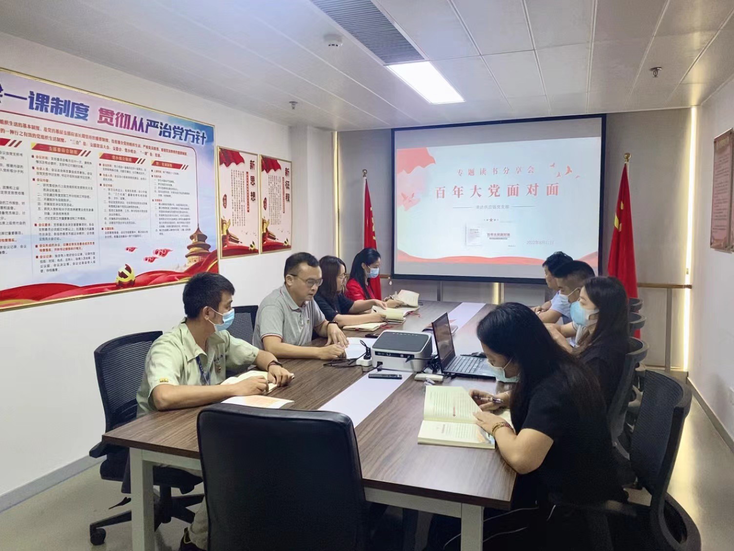 为进一步深入学习贯彻习近平新时代中国特色社会主义思想,全面贯彻落实党的十九届六中全会精神,筑牢历史记忆、坚定历史自信。8月12日,港达供应链党支部开展《百年大党面对面》专题读书分享会,书记苏浩洁同志主持,全体党员参加。