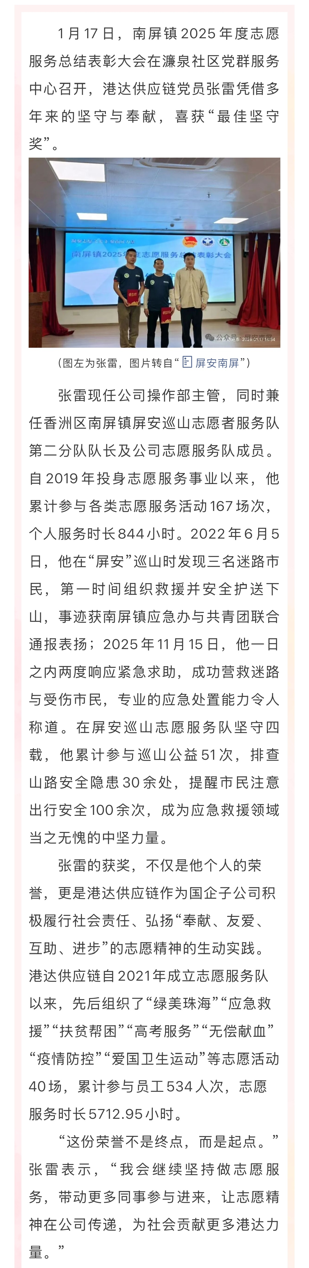 港达供应链党员张雷获南屏镇2025年度志愿服务“最佳坚守奖”